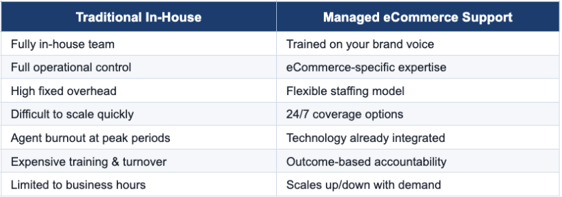 Unlike generic BPO (Business Process Outsourcing) or offshore call centers, a managed eCommerce support partner is specifically designed for the nuances of online retail: order tracking, returns and exchanges, subscription management, fraud escalations, product FAQs, and much more.