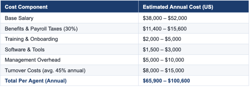 Building and maintaining a high-quality in-house team is expensive — and the costs compound as you grow. Consider the fully-loaded cost of a single customer service representative: