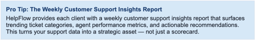 Your support team is a treasure trove of product feedback, UX issues, and operational gaps — if you're listening. Build a feedback loop from support insights into your product, operations, and marketing teams. HelpFlow's weekly insights reports are specifically designed to surface these patterns.