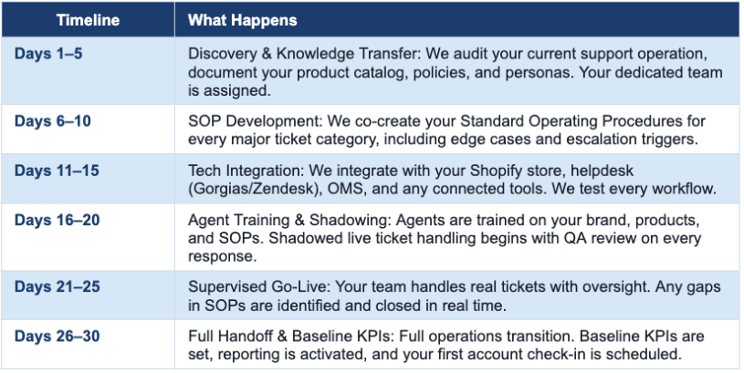 We don't believe in slow, painful implementations. Our structured 30-day onboarding sprint gets your dedicated team operational, trained, and delivering results faster than any competitor.
