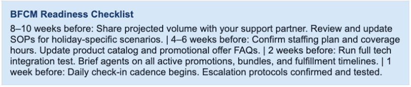 For eCommerce brands, peak seasons are make-or-break moments. Black Friday / Cyber Monday, the holiday shopping season, Valentine's Day, Mother's Day, and major product launches can produce 3–5× normal ticket volumes in a matter of days.